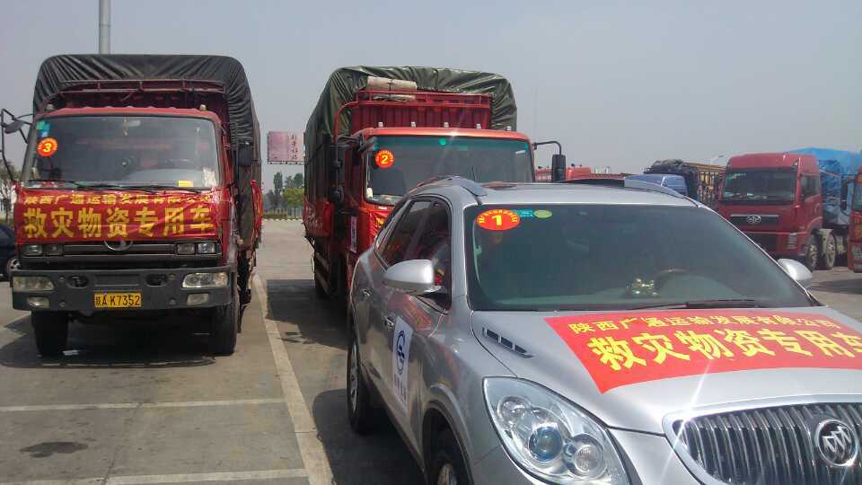陜西廣通運(yùn)輸發(fā)展有限公司救援物資車隊(duì)于4月25日凌晨三點(diǎn)左右,抵達(dá)雅安市雨城區(qū)多營(yíng)鎮(zhèn)的物資集中配送點(diǎn)。本次救援物資運(yùn)送車隊(duì)由五輛大卡組成,共運(yùn)送了價(jià)值十多萬(wàn)元的救災(zāi)急需物資四十余噸;行程八百五十公里;用時(shí)十八小時(shí)。到達(dá)雅安物資集中配送點(diǎn)后,當(dāng)?shù)毓ど滩块T對(duì)這批物資進(jìn)行了檢驗(yàn)、登記。經(jīng)過(guò)四小時(shí)的緊急卸載,車隊(duì)于中午十二點(diǎn)離開雅安。